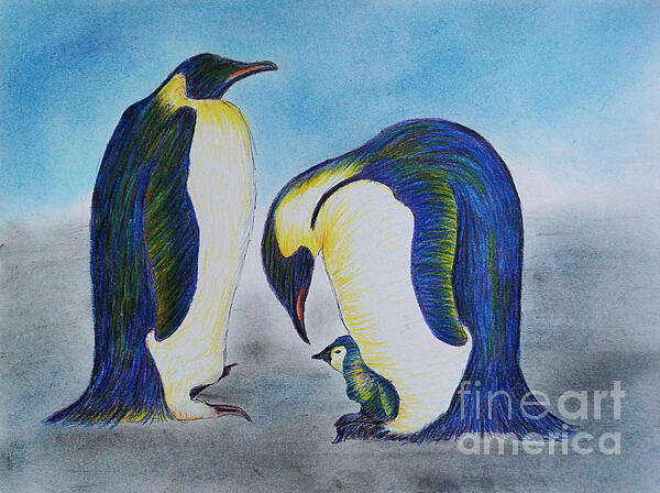 Two adult penguins and a chick are depicted against a blue and gray background, capturing an intimate moment of the chick being sheltered. The adult... more