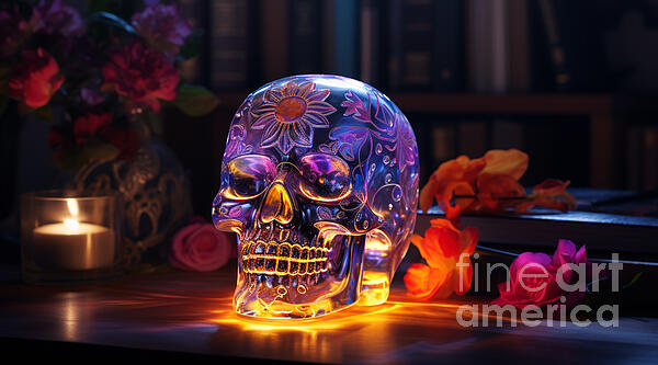 A decorative, illuminated skull with intricate floral patterns sits on a wooden table surrounded by books and vibrant flowers. Soft candlelight adds... more