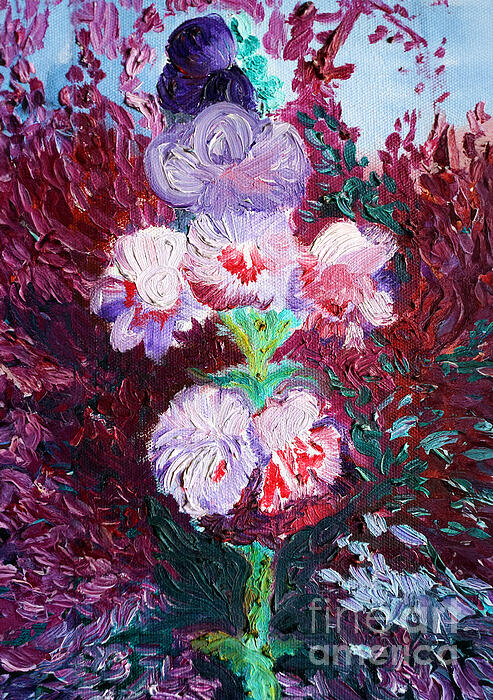 Vibrant flowers in shades of purple, pink, and white stand out against a richly textured background of deep reds and greens. The thick brushstrokes... more