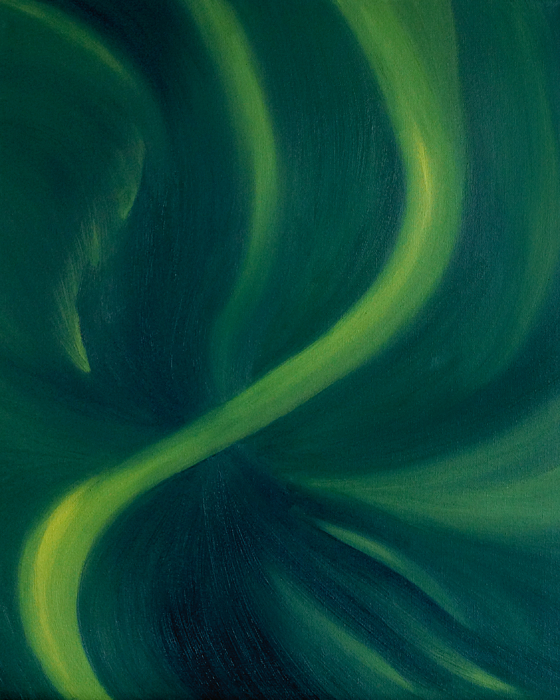 This abstract painting captures a feeling of energy and playful colors to create a dynamic image. The shades of green create movement around the frame, some of them become centralized and others lead away from the center.