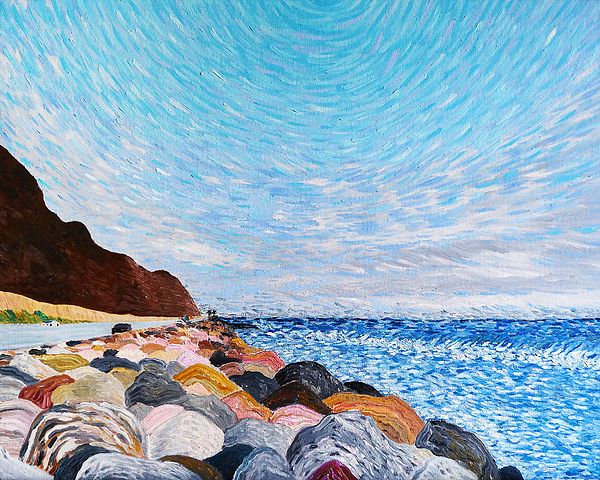 As you stand on Malibu Beach, the ocean shoreline stretches out before you with a dynamic blue sky. The textured shoreline is dotted with rocks of various colors, adding visual interest and depth to the scene. On the edge of your vision, a small part of the winding coastal road is visible, leading your eyes to a couple of cars parked next to a fruit cart in the distance. The bright colors of the fruit stand out against the muted tones of the landscape, a testament to the abundance and richness of this area. The painting invites us to imagine ourselves in this idyllic setting, with the sound of waves crashing against the shore and the salty breeze on our skin. It is a beautiful and serene representation of one of California's most beloved coastal destinations.